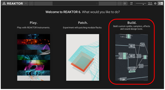 - REAKTORの画面を何にするか聞いてくるので一番右の [Build.] をクリック