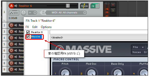 REAPERはオーディオとMIDIを同一Track上でシームレスに扱える構造上、こういうアクロバティックな設定が普通に出来てしまうのが良いですね。